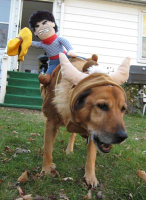 Georgia dressed up as a Bull for Halloween, and we thought she was adorable. She didn't mind too much because she was given treats. :-)