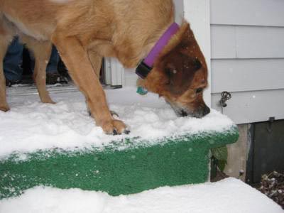 Georgia has been the pickiest foster dog we have had so far, so picky in fact it is hard to believe she was a stray dog. Little did we know she could have been won over with a diet of snow. J Every time we let her out she is eating snow and loving it! We went for a short walk today and when we walked over an un-shoveled sidewalk she would scoop up a mouth full of snow. Her gray muzzle was white on the walk.