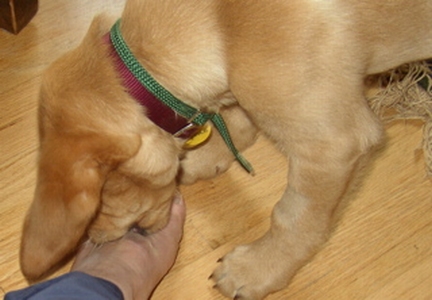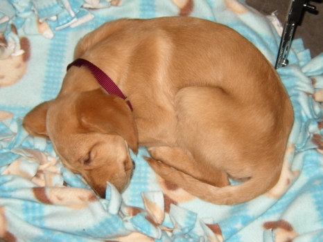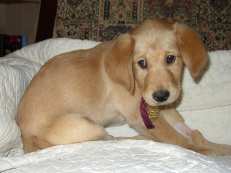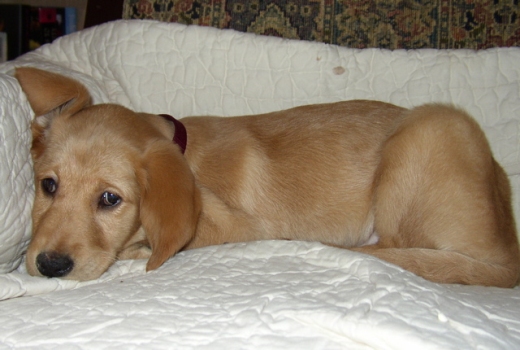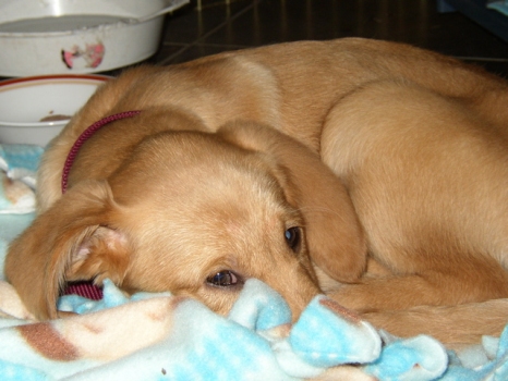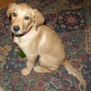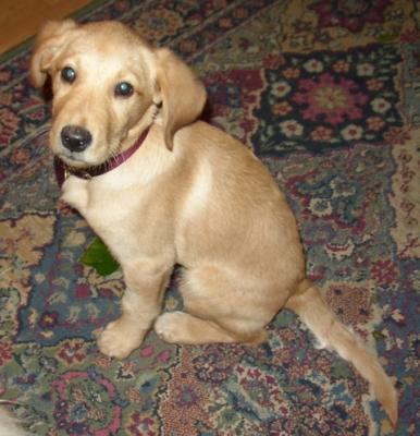 3/1/06: Gilda is an 8 week old female Golden/Lab mix. But what she really is, is a spoonful of sugar. She is so very sweet. She follows us everywhere and loves to cuddle. Gilda is one of six puppies that recently came in to RAGOM, and I believe she must be the smallest - she will be weighed tomorrow at the vet. Gilda is already showing signs of quick learning ability.