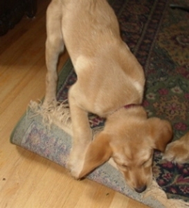 As Gilda is now ready for a forever home, I wonder if everyone knows the tremendous amount of mischief a puppy can get into. If not, this update includes a few naughty puppy pictures (this was a tough call, as I have so many new very cute, angelic pictures). A phrase frequently uttered by puppy owners comes to mind, "it's a good thing you're so cute." And this is so true. Gilda needs someone who will love her through the naughty times as well as the nice. Someone who will teach her and let her be an important part of their lives. As you know, puppy does not come trained and training takes your time and dedication. That said, Gilda is very easy to work with; she comes running when called, most often stops when you say "no," and will "sit" when told or even when not told, but when appropriate. Gilda has been working on walking on the leash this past week. She does very well for a 12 week old puppy. Because Gilda - as all puppies - will have lots of energy, a fenced yard is a very good thing.