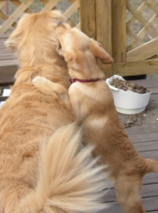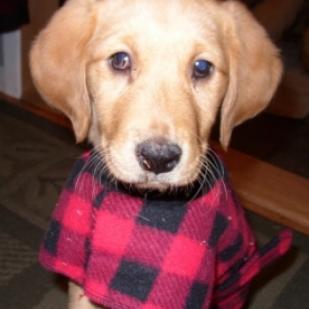 She sleeps in her crate all night, with only minimal whines before settling down and no accidents. In fact she has had no accidents at all in the house. She stays in her crate while we are at work, although she has graduated to afternoons in the "fold-up" play area. Gilda is not as fluffy as some of her siblings, but she has the soft Golden coat. She comes bouncing when she is called and likes to please. Gilda shivered quite a bit in the cold outdoors, so she now has a nice warm coat so she can take a short puppy-sized walk with us. She had a blast on her walk and bounced right along with us; stopping to chew a few grassy stems and to inspect her foster sister's stick.