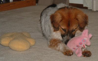 Are you the home Ginny has been looking for? We call her Miss Wiggles because her whole body wags and wiggles when she gets excited. She is doing so well. Her health issues are cleared up, she is a good eater (she gained 6 lbs), doesn't mind being crated, and walks nicely on a leash. She gets along well with our other dogs and our cat, doesn't jump on people, is calm and not mouthy. She is curious and wants to be near you to see what you're doing. Ginny enjoys her Kong, rawhide bones, and will chase a ball. Ginny has not been around children enough to say she is child-tested.