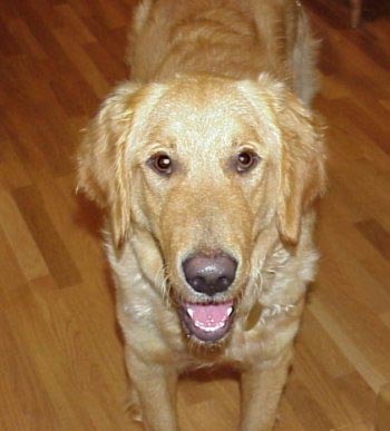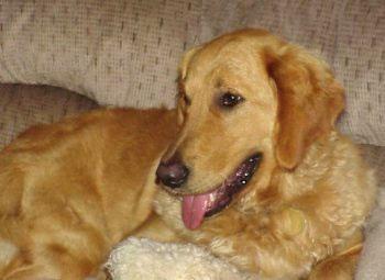 Goldie is a medium golden colored girl with a beautiful coat and a huge fluffy tail. She was born July, 2001 and has been in a pen with her dad and brother since she was a puppy. I'm guessing that she weighs around 60 pounds or so (a good weight). I don't think she's had a whole lot of human contact (positive contact anyway), but she is catching on very quickly here. She still has tons of puppy energy as she's only 10 months old, but has also napped at my feet a few times too. I don't have any kid history on Goldie, but I don't think she should go to a family with small children because of her energy level. She's a very sweet girl and will be a wonderful companion to a lucky family that is willing to continue to teach her what the golden life is all about.