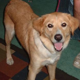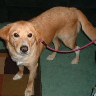 9/11/05: Goldilocks is a beauty! She was a stray, found wandering with a heavy chain and half of a Vari-Kennel attached to her. She was discovered in a very full MN shelter by one of RAGOM's wonderful volunteers, and now we are lucky to be finding this girl a new family! Goldi is a mix of Golden Retriever and some kind of Spaniel, but as you can see from her pictures she looks very golden-ish. She has a beautiful, silky coat with lots of white markings on her face, chest, feet & tail. She is a very petite girl, maybe 50 pounds. She was checked out by the shelter and is healthy; she is HW negative, fecal negative, UTD on all her shots, had Frontline & Heartguard, and was just spayed. She has a very odd bark, it's very soft & hoarse, so barking should not be a problem with her. She has been very friendly with our resident dogs, although she has no interest in playing with them yet. She's been following my girls around, seeming to like them better than the dogs! She was very tolerant of my 5 year old walking her around the house to check things out, so I think she'd definitely like kids in her forever home. She walks very nicely on a flat leash, does not pull at all. I kenneled her for a couple of hours today when we were gone, and she did yap a bit at first, but then settled down nicely before we even left.