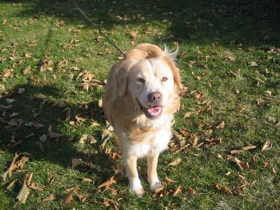 11/21/06: Gruff is here after a long car ride on Sunday from Missouri. Gruff's story is really sad. His owners moved away and left him tied up in the yard. Fortunately some neighbors found him and now he's on his way to being spoiled rotten for the rest of his life! Here's what I know about Gruff so far: he is very sweet, loves attention, gets along well with other dogs, looooooves kids, and loves to play. He is a pretty calm dog. He does have a playful side so has energy in that way, but isn't hyper--just very happy-go-lucky and go-with-the-flow. He walks well on a leash and didn't mind the Gentle Leader one bit. Gruff went to the vet today. The vet estimates he is about two years old and couldn't get over what a healthy, sweet dog he is.