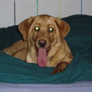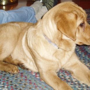 Harley arrived yesterday as a shy, but sweet puppy. He is one of ten puppies left out in the cold along with the mom to fend for themselves (one had already found a home by the time a volunteer arrived at the HS). He is half Golden Retriever and Lab, but has the great Golden personality. He is no longer shy, rather he loves to cuddle and greet people at the door. His whole body shakes with excitement as he waits to be petted when someone comes in. He is a great mimic as he copies everything our two year old Golden does, even to the head movements. He loves to play ball and will retrieve it for more play. He has also learned to "throw" the ball with his head. He is a medium golden color and is starting to develop longer hair on his back. He is off to the vet tomorrow.