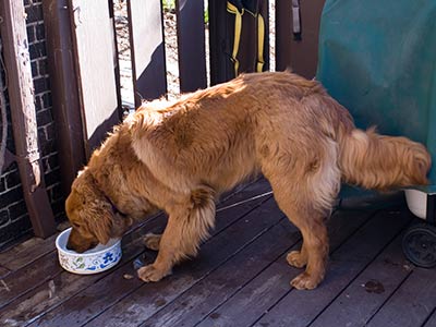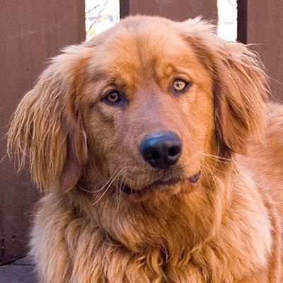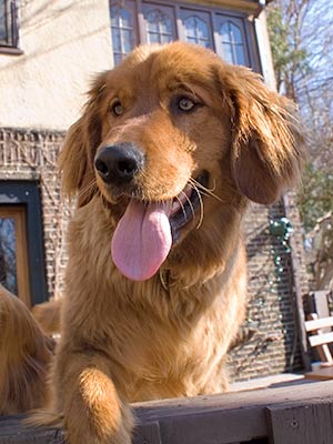 Hogan is a neutered male purebred Golden Retriever—a red dawg with gold-blond highlights that would make a Beach Boy proud. Weighing an estimated 90 pounds, Hogan is a hunka hunka dog with a broad chest and muscular hindquarters. And because he spent the winter outside, he's got a thick, almost cottony coat and shaggy ears that are begging for a trim.