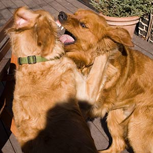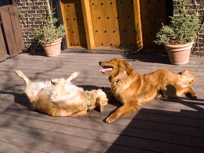 At just over one year old, Hogan has the body of an adult, but he's still very much a puppy in the head. He's also a dominant boy who likes to wrestle nonstop with my three-year-old male Golden, Chaz. Between the two of them, there's about 170 lbs of Golden Retriever slamming into the walls around here.