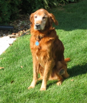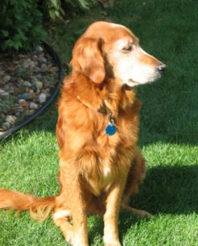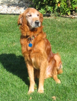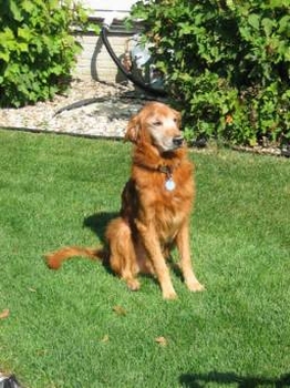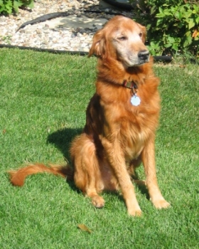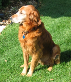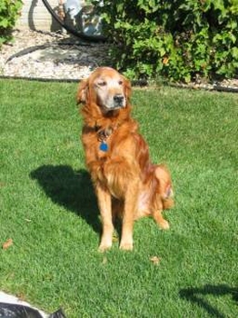 9/10/05: We went to a Humane Society today and brought back Hunter. He is a lovely, kind, quiet, wonderful boy. He is a dark red Golden, not neutered, has a growth/tumor on his left rear leg, and his teeth need cleaning. He is only about 50 lbs. Hunter is very affectionate and has no problem with males, even though he has been abused by men in the past. He's perfect with the rest of our crew (3 dogs), knows "sit", and handled a bath just fine outside in a kiddie tub. I believe he has a slight skin condition (exema), but his ears and eyes are good. His coat was icky from being at the Humane Society.