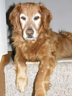 Jake has had a small amount of obedience training. He does listen really well and I don't think it would take much to teach him anything. We took him on a walk on Saturday afternoon and he didn't like the Gentle Leader at first. After a few minutes he walked along with me and only tried an occasional "can't I get this thing off of my nose" swipe with his paw. I told him to heel and he didn't pull at all. I thought he did real well considering he was with strange people in a strange place.