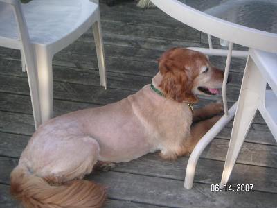Well, I guess it's Ranger's turn to get on the computer, so guess I better wrap things up here.  I am getting along just fine with the troops here and when I go to the vet I'm really a good boy.  I'm pretty attached to my FM when we go anywhere and if she isn't right near me I'll bark to remind her she belongs by me.  I know I can be happy in a home with older, dog savy kids or a quiet home with just me as the only fur butt.  If you happen to have another senior that doesn't want to play, but just hang out, that would be fine too.  And keep in mind, my coat will grow back in a couple months and keeping up the grooming end, I won't ever have to do the "cool shaved" look again:)  If you'd like to learn more about me or would like to meet up, just contact  placementatragom [dot] org  and tell them you are interested in JAKE # 07-349.  Meanwhile I'll hang out here and stay outta the sun.