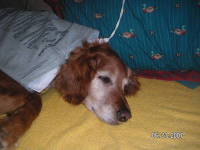 Time went by and suddenly Jake didn't care to chase the tennis balls as much as he used to. The long walk around the field was too much. He would follow behind us, but the next day we would find him tired and sore. So soon the walks were around the yard and over to the neighbors. Then the appetite started to wane. This from the dog who would eat anything at any time. The sight and hearing was going. I kept checking his gums and they were getting light and tacky. So after a business trip for Dad, off to the vet we went. The x-rays showed his spleen was enlarged and most likely bleeding out. Nothing to do but wait and watch. At this time we also found out he had the worse shoulder arthritis the vet had ever seen. So on pain meds he went. While Dad was gone on another trip I realized it was coming to the end. I made an appointment and it was agreed it was time. So Dad got home on Friday and on Saturday they went on their errands and came home to wait for the vet to come help Jake cross the Rainbow Bridge. I have sat in the same place on my kitchen floor to help my dogs cross the bridge, but this time Jake didn't want to lay on my lap. He laid down on the blanket and pushed his head toward his Dad's hands and looked up and started to lick his hand, to comfort him and tell him it was alright, it was time. And so Jake passed over the Bridge with his Dad's hands on him til he drew his last breath.