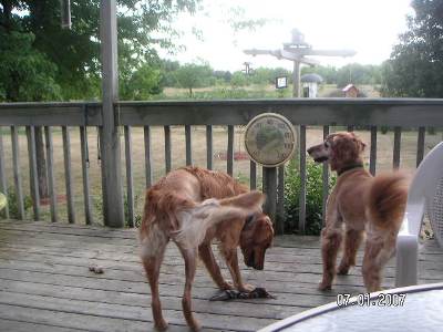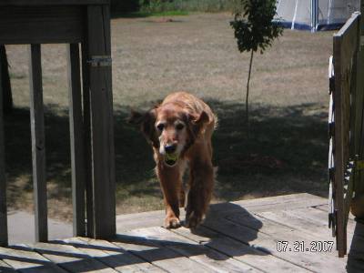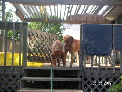 There is a picture I'm sending of Jake and Ranger 07-237, his foster brother, on the deck.  What you can't really see is that for just a moment Jake was being frisky and interacting with Ranger.  Up until the other day,  Jake would not go into the wading pool.  So I threw his tennis ball in the pool.  It took him some perusing the situation, but he finally went in.  We aren't talking laying down and enjoying it, but he did get in, get his ball, get out and bring me his soggy prize.