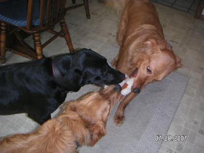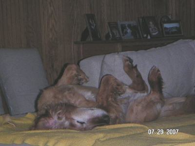 I finally have got the foster parents to figure out I like to be in the kitchen by myself when I eat.  So if they put a gate up between the dining area and the kitchen, I will eat whle Ranger eats.  I knew what I wanted, but hey sometimes the humans are bit slow.  I'm still very good with Reba and Ranger, but if Ranger bugs me too much I will give him a growl and bark and he hightails it outta my way.  But we do have our good moments too, as you can see by the pics.