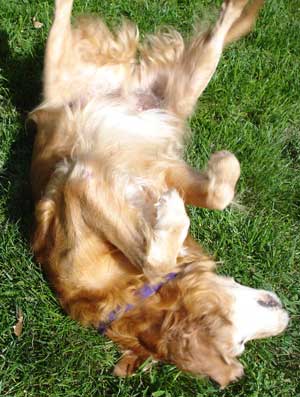 Jake has settled in nicely here. He finds his way around the house and yard pretty well. He does bump into things from time to time (especially if a chair is not pushed in or a door is left open), but he doesn't move that fast so the bumps are gentle. And now that Jake is more at home, we're starting to see more of his silly side. He loves to roll in the grass and get tummy rubs. De-fuzzing tennis balls is his specialty, and believe it or not, Jake has learned to sneak up on the sofa when we're not around! Not that we mind all that much, but it's pretty cute that he only does it when we're elsewhere. We still go for long walks and, as always, he is a perfect gentleman on a lead. And last but not least, his skin infection has cleared up beautifully and he hardly scratches at all now. What a gorgeous boy!
