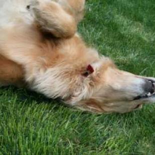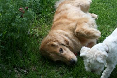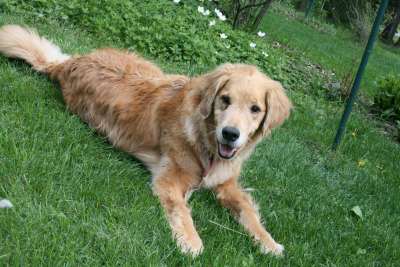 Jameson has been to obedience school and was also in agility training. He is very good about listening to commands. Sit - stay is awesome!! He does not have any storm anxiety or rarely barks. He will give a half bark at the back door when he wants in. He rides great in a vehicle. He loves to cuddle and will lay his head on my lap at night when we finally sit down for some relaxation. He has no fear of strangers. He leans against you for scratches. When meeting other dogs he is better off leash than on the leash. He did great meeting me two crazy boys. One a GR the other a 8# maltese mix. So big or small he loves them all!
