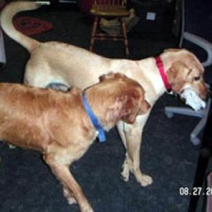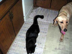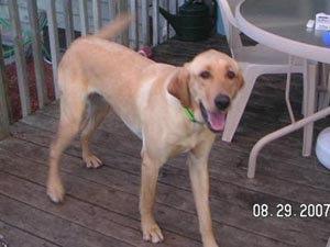 He is fine with the cats. In fact, wish I could have gotten a picture of him eating his food with the 2 cats eating their moist food next to him. He is ball crazy and can run like a greyhound. He brings it right back, drops it at your feet and is ready to go again. The only 'problem' is he doesn't know sit or anything else. But we are working on the "sit" thing for now. He is very trust worthy, doesn't run off and comes when called. He loves to lean in for for some loving. Last night I invited him up on the couch and he is so big/long, he got everything up except his hind legs. Once I pulled the rest of him up, he curled up and cuddled. After that he knew it was ok to put all of his body on the couch. He gets along great with resident Jake and Ranger 07-237, as long as he doesn't try to take a ball away from Jake, then there's some 'talking' from Jake.