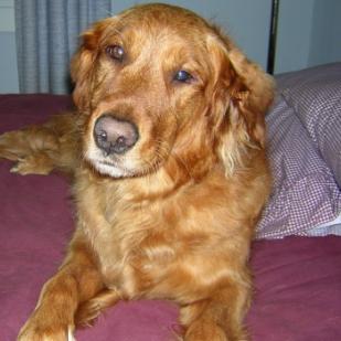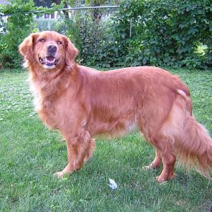 Jinger has been at my house for a little over 24 hours. She met my 2 male Goldens in the yard without a growl, she met my cat at the door and almost decided to make a run for it, but did decide to come in. She is small, I'd estimate around 50 pounds, medium dark red with a nice coat. She had a bath, brushings and some trimming done today and she was very tolerant, even when I worked on some matts. I haven't attempted to trim her nails yet as I didn't want to drive her crazy on her first day here. We had a bad storm around noon and she couldn't have cared less. She is a very sweet dog and so far I haven't had a single problem with her. She was adopted in early 2001 and was returned to RAGOM this past Friday as a seven year old...because her family no longer had time for her. She is already up to date on her shots and had a heartworm test this past April. We will visit the vet next week but since she has been vetted recently I don't need to rush in. She came to RAGOM already eating an excellent brand of food - Eagle Pack - so her diet since 2001 has been very good...I bought some more today so she can continue to eat her familiar brand of food. So far she has been an absolutely perfect house guest; she has been quiet and I think a little intimidated by her unfamiliar surroundings. I will write more updates as she becomes more comfortable and I get to know more about her.