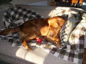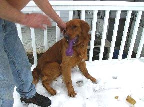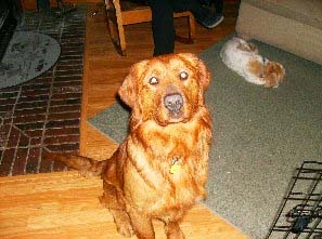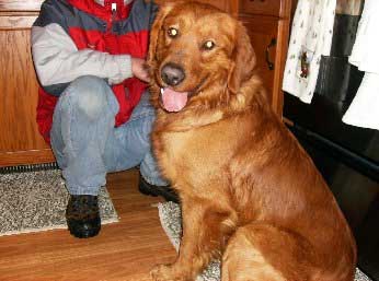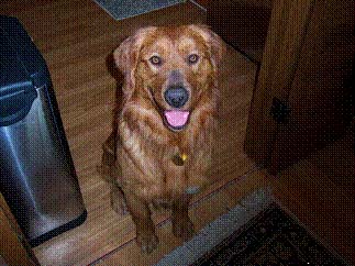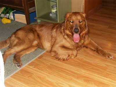 JoJo aka GoGo, because he is a busy boy, went to the vet today and weighs 67#. He is a gorgeous, medium sized male golden. He has made huge progress in the past few days and is now out of the kennel in the house with supervision and getting along with resident dogs, RAGOM golden Maren and shih tzu Yosi. He absolutely LOVES to retrieve in the back yard and is learning to chew on appropriate items, like flavored Nylabones, which he is most fond of!! He is doing his jobs outside and is very willing to be in the kennel when need be.
