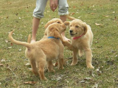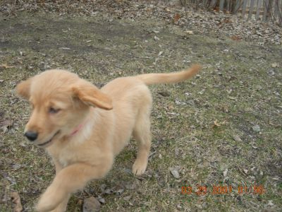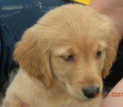3/25/07: Hi, Joliet here, let me introduce my 2 siblings and myself to you.  We are Irish (07-140), Joliet (07-139) and Keswick (07-138).  We came from a puppy mill in North Dakota yesterday and have just started our journey towards living the Golden Life that we dreamed about since we were born.  Our foster mom tells us that she thinks we are about 8 weeks old.  While our start in life has been a difficult one, the true spirit of our Golden nature is already peeking through and we should be a wonderful addition to anyone who wants to be our forever family.  We do have a few obsticles to overcome first.  When we were rescued by RAGOM, the vet told our foster mom that we have Strangles.  This is NOT contagious.  It is caused by an overload on our tiny immune systems (lack of good food, no clean environment, lots of stress on both our mom and us).  The good news is that this is all reversable.  We have already started down the road to recovery and as we grow older you might only notice small signs of our rough start in life (like dry skin).Our foster mom tells us that we get to hang around "Camp Canine" for about a week and then we will be ready to find that family whom we can call our own.  I guess the wait won't be so bad...hey, we get spa baths, great food and naps in the sun.  Speaking of naps, the birds are singing so sweetly outside the window that I think I'll  take one now.
