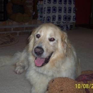 Jordan is such a wonderful boy. He is a big, beautiful guy & at his last weigh in he was 94 lbs. That sounds big to most but he is not fat by any stretch of the imagination...he's just a tall fellow & is long & lean. I don't think this guy has a mean bone in his body. He gets along well with everyone. He has a special friend in my female golden "Lady Lu". He loves to play with her, sleep with her & follow her everywhere. They are pretty inseparable. It's hard to believe that Jordan is 9 years old...he keeps up with my younger goldens without any problem. He can even keep up with the 4 wheeler when we're out riding in the field. Jordan can give high 5's when he's feeling like it & is a good high jumper too....I'm guessing he played basketball in a past life!!