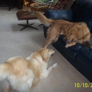 Jordan made the adjustment to living with my 3 other goldens (2 females & 1 male) & 3 young kids with hardly a to do. He already has a new playmate & girlfriend in his fur step sister, Lady. You should see them play...you would never guess that Jordan is 9!! He has also decided that living in the house is great & sleeping on the bed is even better. It's a pretty high bed & how he makes it up there I'll never know. He'll sleep up there during the day but at night he prefers to sleep on the floor.