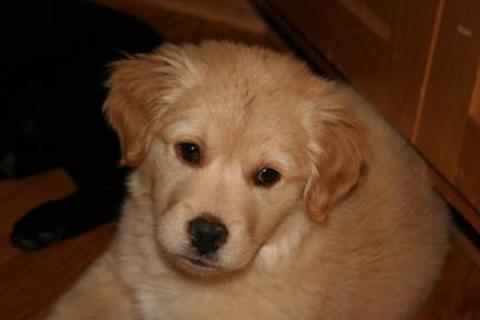 4/28/06: Meet Kati! Kati is a BEAUTIFUL little baby girl just 8 weeks old. What is there to describe about a Golden/Lab puppy? She smells like sawdust and is as soft and fluffy as cotton! Kati is hanging out here with us along with her sister, Pia until they find their perfect home. Kati loves to play, play, play! She is so cute when she runs. It?s kind of a hop, skip, run kind of thing! She gets along with the other Goldens in the house and isn?t at all shy. She will snuggle in with any of the other furrbutts and even enjoys getting kisses (see below!).