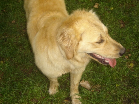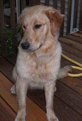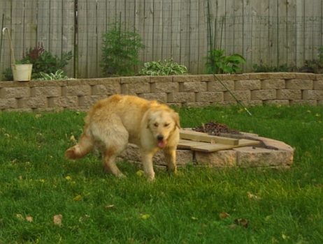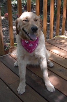 Katie loves having playmates around but she enjoys having her humans close by as well. She gets along great with dogs of all ages. She plays rough with the boys but is gentle with my senior, Amber 04-267. After a great game of tackle or chase the Golden, she is content to come and lay her head in my lap for a power nap and then she's up and ready to go again. Katie's favorite thing to do is run and belly flop into the kiddie pool, soak up as much water as possible, then spray everyone with the waterâ¦who needs a sprinkler when you have Goldens??