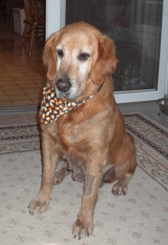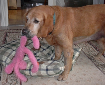 We have changed her name to Katrina, we call her Kati. She is truly everything we wanted in a dog, no bad habits, walks really nice, is settled and laid back. At nite we take her in our room and close the door so the cats will not distract her and she lays right down on her bed. Today we went back to work, but my daughter was home visiting and Kati had the run of the house. I really don't see any problems except making up to the cats. Have attached a picture of her and a new toy I got her. I think she is happy!