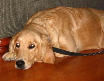 9/17/06: Candy is a five-year-old puppy mill girl who arrived this weekend with Maree 06-386. She is timid and frightened. She spent her first night in boarding but is getting a break tonight spending it at our house. She goes in tomorrow for her spay. From the looks of it she probably had a litter recently. She is absolutely gorgeous. A petite blonde girl with beautiful deep brown eyes. She is a little more socialized then most puppy mill dogs. She comes to you for pets and attention and does get her tail going. She loves my kids and their friends. We actually got her to eat and drink today. Of course, her meal consisted of canned dog food mixed with our leftover steak. She has done fine with my dogs but does not play. She also will go through doorways and on wood floors, which some mill dogs have trouble with. She has only so far navigated a couple of steps and has not ventured to the other levels of our house. She did not have any ear infections so that was good news. We are still waiting for her to give us a sample to check for worms. I am not sure of her weight but she seems to be at a healthy weight. Stayed tuned for more after her spay.