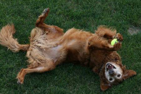 The second is King engaged in what we call his yoga: he lies on his back, holds a ball at arm’s length, and just lies there staring at it for a minute or two – then he drops it, catches it in his mouth, and starts the whole process over again. This often goes on for quite a while. We’re not sure what it means, but you can tell from the picture that he has fun doing it.