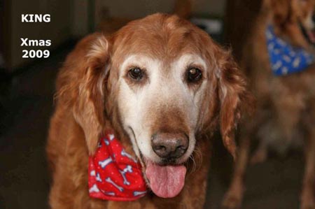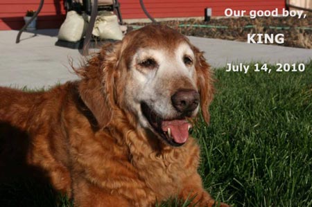 It is with broken hearts that we write to say that our good boy King was euthanized today. King came to us from RAGOM in 2006. He quickly managed to make a place for himself amidst two resident goldens, and a place in the hearts of his mom and dad. He loved his racquetball and his food, and just taking in the world on a nice day.
