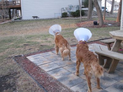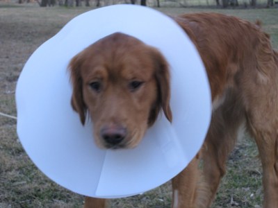 Well, Spencer went to the vet yesterday to get neutered.  I think he was really happy when Foster Dad dropped him off, but looked like a deer in the headlights when Foster Mom picked him up!  I know he was thinking “What just happened?  That was NOT okay!”  Oh well for him!  They said he did great.  They even scraped that little bit of tartar off of his teeth, so now they are super white!  He has to take it easy for 10-14 days, with the first 3-5 being the most important.  So far, he really hasn’t wanted to do much.  He just walks around with the cone on his head, knocking into EVERYTHING.  It’s pretty funny.  It’s actually “double” funny since our resident golden also has a cone from a minor surgery last week.  Two dogs, two cones!  I've attached a couple pictures.  One of Spencer sporting his cone fashion statement and another of both dogs with their cones, eyeing the neighbors cat as it walked by.  It was pretty funny to see two cones moving at the same rate as the cat crossed their line of sight.