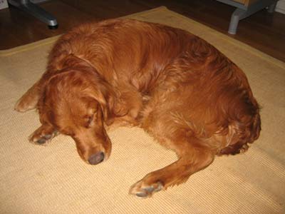 Leo the fabulous is... well, still fabulous! He is easily the most laid back guy I've ever fostered. Not that he doesn't love attention -- he is definitely your typical Velcro Golden and will seek out and soak up any and all attention he can get. But the minute you aren't petting or playing with him, he lies down and takes a nap. The great part is that he's a really active guy--loves playing with other dogs and going for long walks, and I'm told he loves swimming and boating. But as soon as he's got some "downtime," it doesn't take long before he makes himself comfortable and is happily snoozing away. In fact, he did this at the vet's office tonight while we were waiting in the exam room. He didn't just lie down with his head on his paws, but fully on his side like he didn't have a care in the world. No vet nerves for Leo!