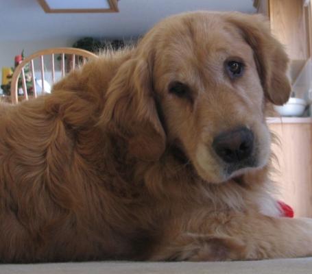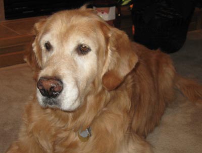 1/17/06: Logan got comfortable in our home right away. He walked up to us and the neighbors with a big kiss and a constant tail wag. Logan is 6 years old, 100 pounds, red to blonde in color, and neutered. Logan was originally purchased to show and he came from a long line of champions. He has been trained in all commands and showing techniques. The family was not able to show him because he has a black spot on his tongue. Bummer! Now he can be just plain old, lovable Logan!