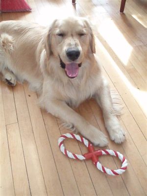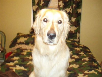 Sam greeted the cats with a puppy dance and a smile, nothing else, so that's good. Scooter (cat) and Skeeter (cat) just looked at him, shook their heads, and sauntered away saying to each other "not another foster - for Pete's sake... what's with these people?" He is now stretched out on the floor exhausted from his play; he is panting a little but appears to be adjusting well to being inside the house. I almost forgot to tell you what he looks like!! Amazingly beautiful! He is a light colored golden boy through and through with the fluffiest butt and beautiful brown eyes. He has a sweet little cowlick running down his nose that makes him look like he's full of mischief. He can't wait to meet a potential forever family to show off his pearly white teeth with a big doggy smile. Please contact placement