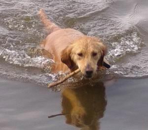 Her favorite activities include swimming, retrieving sticks, playing tug-of-war with her rope, going on walks and runs, tummy scratches, etc, etc. We do keep her kennel-trained at night. She often puts herself to bed when she hears us brushing our teeth at night. And if we are both gone during the day, she stays in the kitchen with a gate.