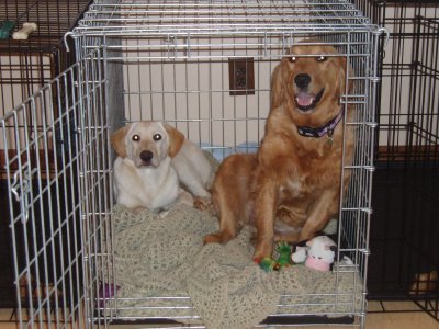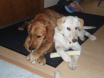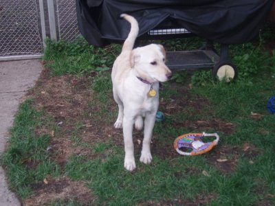 Tiara # 07-307 and her sister Kiara # 07-308 arrived at my house on Wednesday evening.  Both are pretty shy little girls when it comes to people, Kiara more so then her sister.  Both are happy, energetic pups, who love toys, playing with the big resident dogs, and treats.  The "Girls" came up of Iowa and both have had their rabies shots, a set of puppy shots, and have been already spay.  Their booster shots are due May 25th - 30th, and I'll be taking them in next week to have their sutures removed.  They are adorable golden/Labrador crosses.  Kiara is a light tan in color with a little white blaze on her forehead and nose, with white tips on her toes, Tiara is a solid light buff.  Both girls have beautiful black lined eyes (I am jealous!).  Over the course of the next few days, we'll be working on sitting for treats, potty training, and over coming their shyness.  If you would like to meet either one of this sweet girls, please contact placementatragom [dot] org.