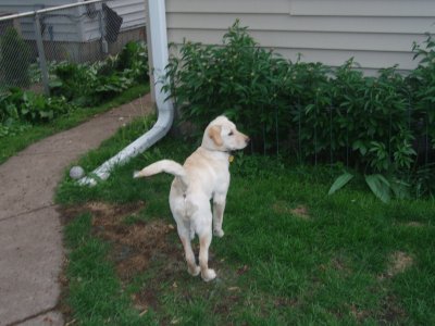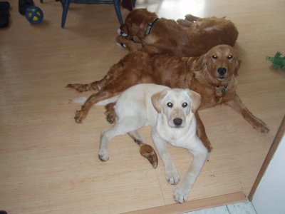 Hi everyone. Last night I got a new foster home so I had to change my name. Tiara sounds too much like Sierra who already lives at this house (plus I like to get dirty anyways and Tiara doesn’t really fit me to be honest.) I really don’t know my name yet, so that is great! I miss my sister Kiara (07-308) but there are 3 goldens here to play with so I keep busy! My other foster Mom thought Kiara and I should split up so we didn’t depend so much on each other. There is this one special dog here named Autumn (07-180) and she even let me snuggle in her kennel with her last night so I wouldn’t cry. She told me she used to be a mama doggy all the time so she likes to take care of me, YEAH! I also have a big brother, Stetson, an older puppy sister Sierra to play with. Sierra taught me how to dig a hole already. Boy that is fun! And then I roll in it and my blonde coat gets all brown. My new Mom and Dad said I am a very friendly puppy. I love to give kisses and show off my puppy breath. I love to chew since I’m teething and have a few favorite toys. I have beautiful eyes and my coat is really pretty. I got a bath last night too and sat like a princess in the tub. I LOVE to eat food since I have to grow up nice and strong. I met a big purple machine last night named Dyson. Dad told me he cleans up our floor by sucking up all the dirt and pet hair, but boy is he loud! I got kind of scared of him and hid behind Mom’s legs. I met some hairy things called cats too. It is funny to play bow at them and get them to make this MEOW noise. I just like to see if they want to play with me. Who wouldn’t want to play with me? I get to go to the vet tomorrow and get my second round of vaccinations. I am already spayed so I’m pretty much ready to start looking for my forever home. If you think you might like me, email placementatragom [dot] org