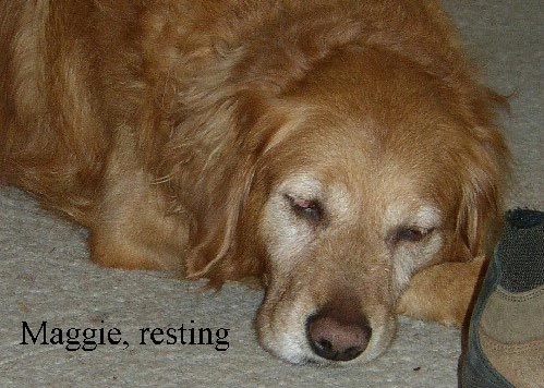 Here is a new picture of Maggie. Maggie went for a nice long walk and came home with pricklies. I haven't had time to comb them out yet so she is laying near me pulling them out herself. My two young nephews loved Maggie and frequently apprised their mom of her fine qualities. Mom didn't take the hint, so Maggie Mae is available to some lucky person who wants to go home with the Gold!