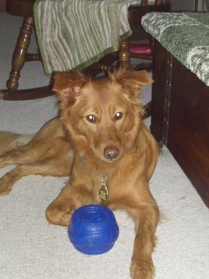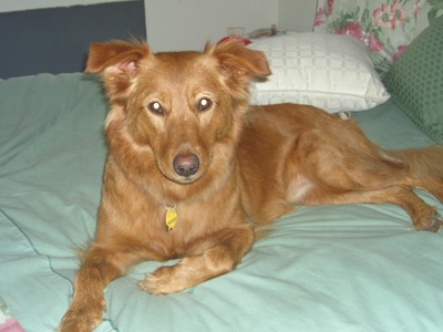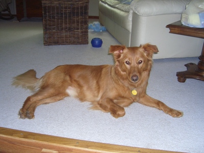 Maggie (1 1/2 year old golden/collie mix) arrived at our house yesterday afternoon in the middle of a thunderstorm. She does not seem to be effected by storms (thunder or lightening) and seems to enjoy riding in the car. She's as cute as can be, rather small and petite for a golden / collie mix. She is UTD on her vetting, per the vet records I received, and she weighs 43 lbs. She shows no agression at all, even with the 7 lb snippy resident dog, and she has pretty much ignored the cat. She has engaged the resident sheltie mix in many rounds of play and afterwards likes to lay on the couch with her head in my lap for a rest. She knows her name and has been through obedience training, so she knows basic commands. She seems to be food motived so I will try to see if I can engage her in some backyard agility training. She is housebroken but with everything so new she has had a few accidents, probably my fault as I'm not quite sure what signs she is giving me when she needs to go out. She would make a great addition to an active family as she loves to run and jump, she would probably do well in agility as she is smart and quick. I'll let you know more when I get a chance to know her a little better.