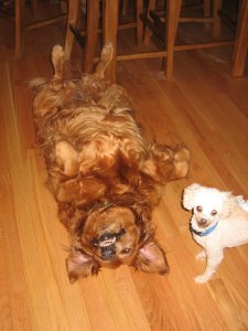 Hi World! It's Maggie and Scooby, the dynamic duo! All is well in foster care. We get to run and play, eat healthy, and we're even getting a spa session next week Maggie snores, but she makes a great pillow (Scooby speaking). Scooby is a great little brother - he likes to make sure I'm settled and comfy before he heads upstairs to bed with the other pups - unless there is a treat - I'll lost to a peanut butter bone :) (Maggie speaking). . That's about it for now. Oh, wait. Here's a picture of the biggest pup in the house (Maggie) next to the littlest pup in the house (Bailey). Cute, huh? We'll check back soon! Love, Maggs and Scooby