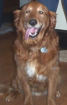 Mason was transported to Eden Prairie today (thanks RAGOM volunteers). He is the epitome of the Golden Retriever and a nicer boy you wonât meet. I broke every rule in the book when it comes to introducing my resident dogs to this sweet boy. I had him in the backyard and tried to open the door and let 1 dog out so we could have a calm meeting. However, it didnât work. All four dogs pushed their way past me and came bounding out at Mason with Taffy in typical puppy fashion jumping at his face and my other three with their noses sniffing him to make sure he checked out ok. The dear boy took it all in good stride. Not a growl or snarl, although he did keep trying to turn his head so Taffy would quit jumping on him, and his legs were stuck because my dogsâ noses were âdown thereâ so he couldnât get away from Taffyâs jumping, but even with her puppy behavior, not a word out of him. I apologized to him profusely, and thankfully he is who he is and he was able to handle the rude doggy behavior (and the human stupidity) without a problem.