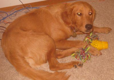 Mason is about 8 months old and appears to be purebred. He visited the vet for a check-up last night and he is very healthy! He is also now up to date on all of his shots, micro chipped and he will be neutered on Friday. Mason weighs 54 pounds. The vet guessed that as a full grown adult Mason might weight about 65 pounds, so he?ll be a very nice size.