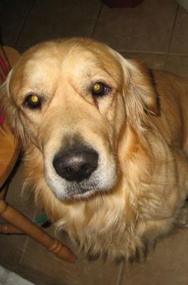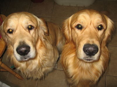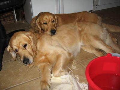 Max and Luke are wonderful foster Goldens. They are 2 years and two months old. They are litter mates that have always been together. Their original family is being deployed to England for three to four years, and cannot take the Goldens with them. England has 6 month quarantine regulations. The family had two children who enjoyed the boys. Everyone got along fine. They are free spirited, high energy Goldens. When not outside running around, about a foot apart, they are indoors and in constant contact expecting non-stop pets. Ever try to put your socks on in the morning when you have a big head with gorgeous brown eyes on each of your knees?? They have had free run of the house since their arrival. They are house trained and have had no accidents. They are free fed and both eat out of an elevated feeding stand at the same time. Both drink out of the water pail at the same time. As the picture shows, when one lies down, the other places his head on the other's back. At bedtime I just say time to go to sleep and they lie down and go to sleep. They are currently being treated for ear infections and will be neutered the first week in June. They must be adopted as a pair, and will not be separated. More notes next week.