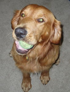 I have had Max for 10 days now. He is a very sweet and gentle Golden. He has the best mellow personality that I have ever seen. He is housebroken and since living at our home has not had any accidents. I can tell you when he looks at you with those precious eyes you just want to melt. He has the big blocky head, muscular build and very red in color. They estimate that he is around 2yrs old. He is very playful and always wanting to play fetch. He loves all toys, especially squeaky ones. You know he was loved by someone before he was lost because he knows the commands come, sit, stay, and give. Since living with us, he constantly has a toy in his mouth. He will sits in front of you and waits patiently till you throw the toy, then brings it back to you for more. I'm sure he could go for a full hour, but he is still recovering from his neutering 2 weeks ago. He needs to be mellow for a few days yet until he fully recovers.