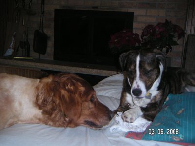 I just wanted to send an up-date on Max because I thought it would be helpful for his waiting "forever family" to know how he did in a different home. Good trial!   Max is a very sweet, wonderful dog. He becomes velcro. He loves the human. I think he acts younger than his age (not obnoxious, but spunky). His teeth are good too! Max was left in the house during the work day without being crated. He did not destroy anything inappropriate. No accidents in the house. He greeted me at the door when I came home (couldn't get the door open, cause he was there) & always was happy!  He is THE PERFECT DOG! Well, I digress....he is whiny, vocal, & loves to eat! & I was warned also about getting into the garbage. The garbage is under the sink, so no problem. Although, lazy mom, bags it & puts it on the porch for my next trip to the can. Max attacked it like a scavenger! Beware....   Max wants to say that he has had a great time here playing with Bud & Sam. Foster mom took us to daycare yesterday & I had a blast! Came home very tired & got stuck in the car, on the floor. Sam helped rescue me. I was so tired, I couldn't move.   and...I got a "frosty paw". I thought that you just put the whole thing in your mouth & eat it....I was shown how to lick the luscious thing! (I want more of them).    Foster mom dog-sitter is going to miss this guy. He has touched my heart. He deserves a home that will treat him like a king & love him greatly. He is worth it & he will bring you joy with his play fullness & love. His big head & big feet & big heart are so worth it, believe me.   Until the next one, Max....I love you!