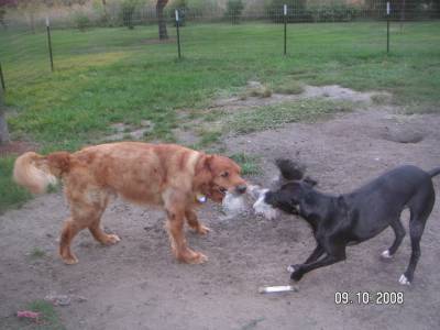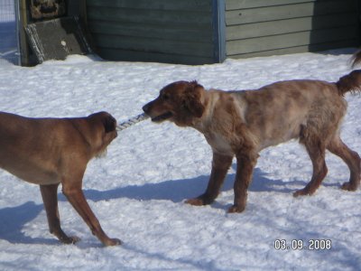 I think this sums up Max's week end so far :)... He has been a busy boy in and out, running in the field, playing tug, chewing on marrow bones, welcoming the new kid Jake (BJ) 08-243, and keeping fit by getting those naps in.