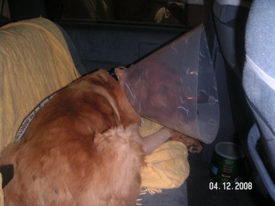 Typically when riding in the doggie mobile Max lays on the floor between the front seat and the bench seat. Today he actually cooperated and rode home on the seat. Luckily he is such a sweet easy going boy and will potty on leash. He is not thrilled about being kenneled, and was out of his kennel most of the day at the vets office, so while I do updates or watch TV etc he will be out of his crate (which is Mastiff size) and can lay on the floor or couch with his e-collar off as long as he doesn't lick the incision. While I have been typing he has been asleep on the floor next to me with no cone on.