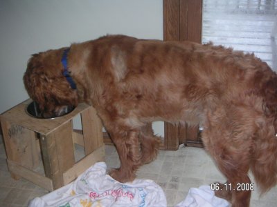 Max had a UTI (urinary tract infection) and was losing protein in his urine, which is not what we want. He was put on Baytril for the UTI, Sucalfote for a couple weeks to protect his tummy lining against any ulcers, tummy upset etc., and on Prednisone to help boost the Baytril. We are in the process of weaning him off his prednisone and he will be totally off it in 2 weeks. When his protein loss count came back high again he was put on Enalapril which helps protect his kidneys and allow them to work more efficently. He will remain on the Enalapril the rest of his life. For now we have Maxie on V-Caps and will remain on them until he can go on perscription JD food which helps with the joints etc. Moderate leash walks will be best for Max to keep limber and in good shape.The UTI is gone so no more antibiotics needed.